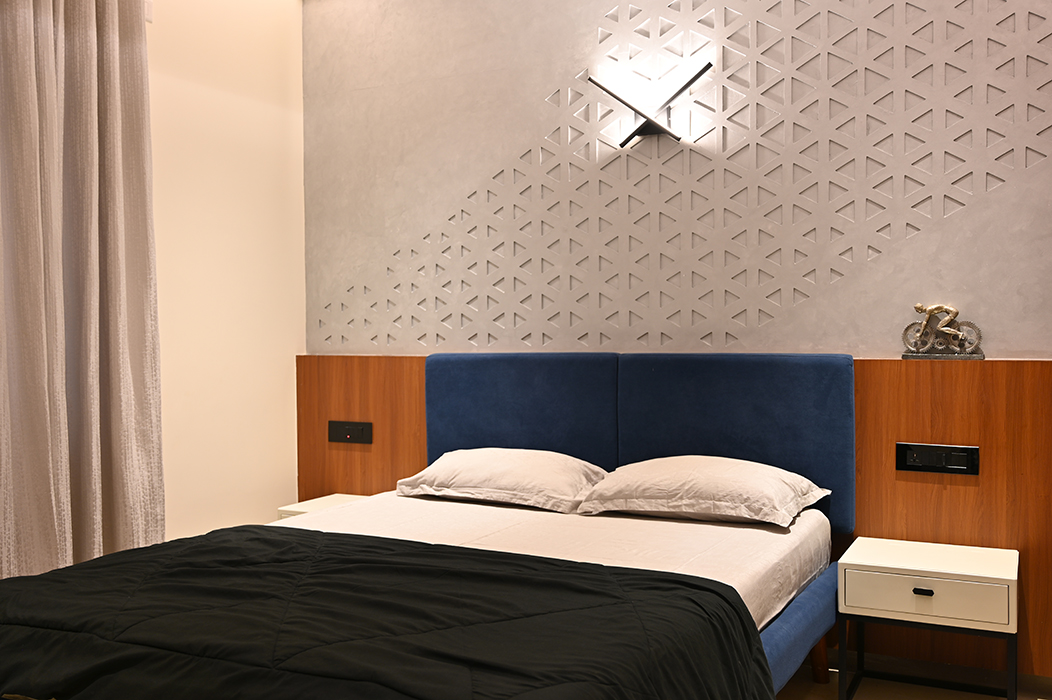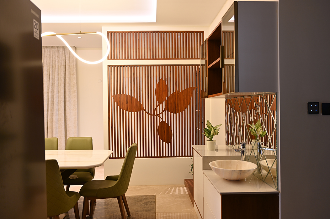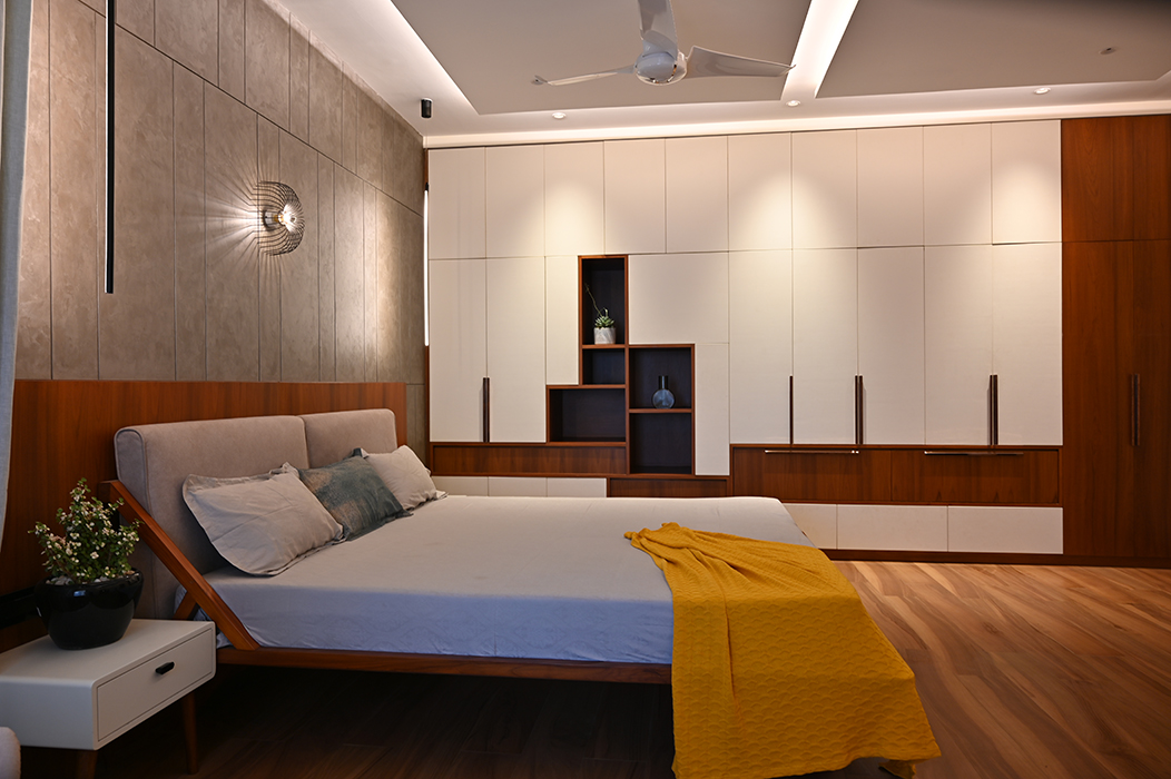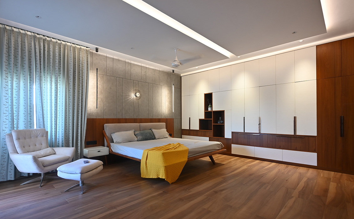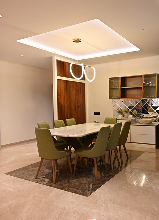 This 5 BHK residence features an intricate partition design in the foyer, leading to a finely crafted marble-clad TV unit. The dining area hosts a matching table with a designer light fixture at its center. A breakfast nook, blending seamlessly with the kitchen's color scheme, adds a touch of elegance. A sleek headboard and seating area accompany a guest wardrobe. A beautifully designed pooja area, enclosed by a glass partition with a designer wood carving, stands opposite a detailed office workstation. The master bedroom is accentuated by vertical lines in a concrete finish, the wardrobe incorporating the scooped-out volumes juxtaposed with solid ones against the wall creates an intriguing design. The other two bedrooms boast simpler backdrops with splashes of color. The guest bedroom on the second floor features a blend of wood and blue decor for the headboard. A cozy conversation area transitions to the open terrace.