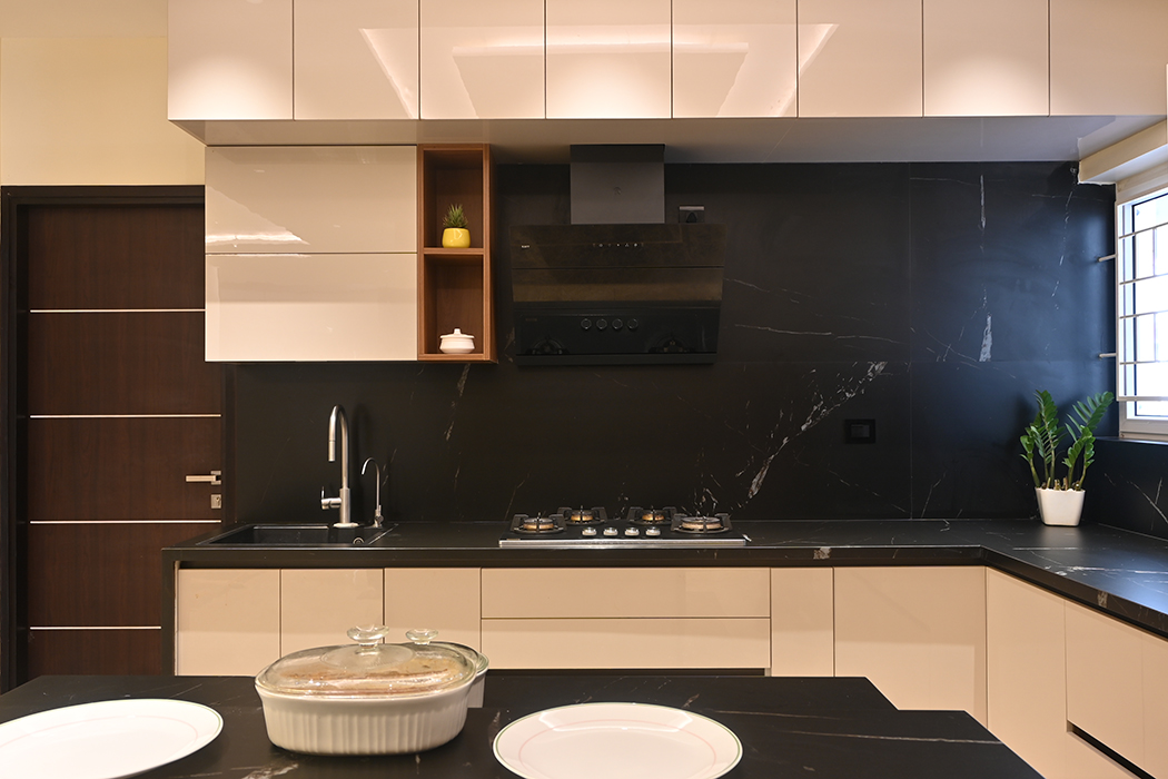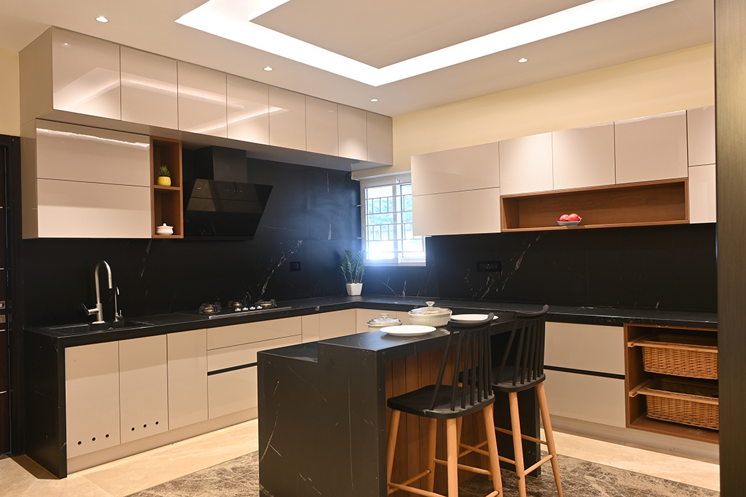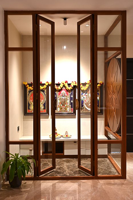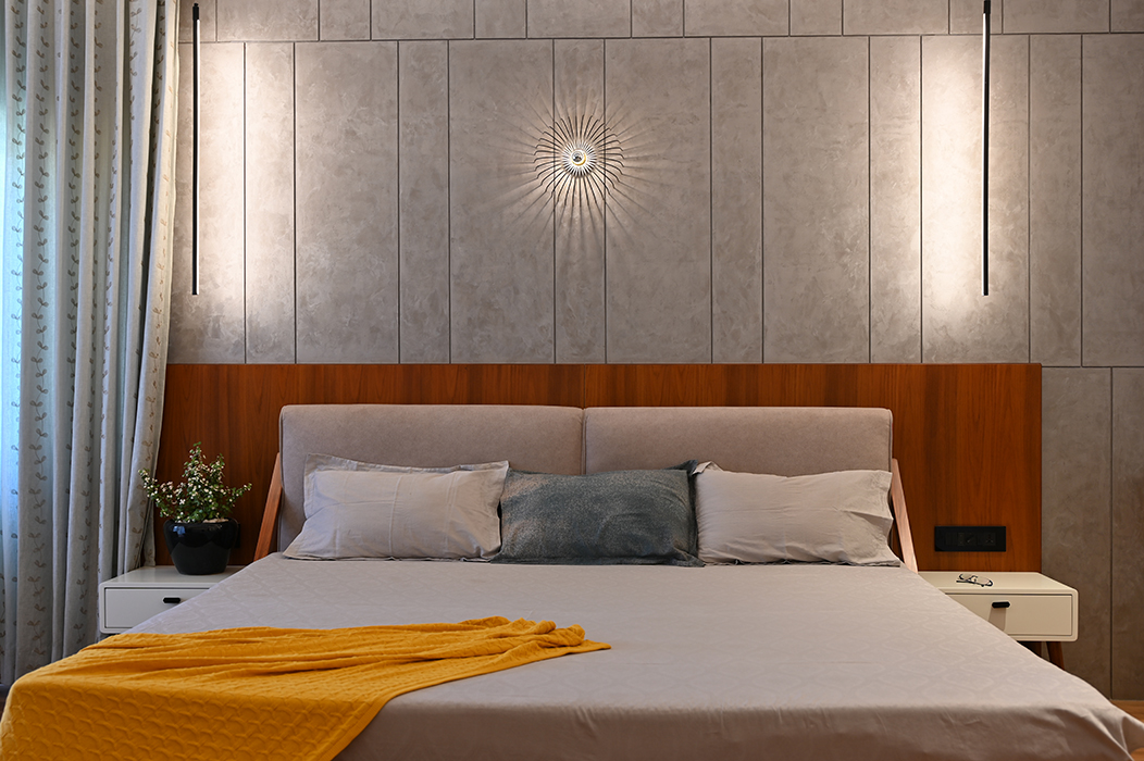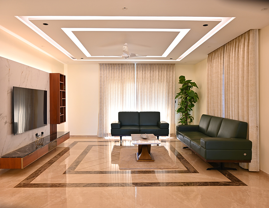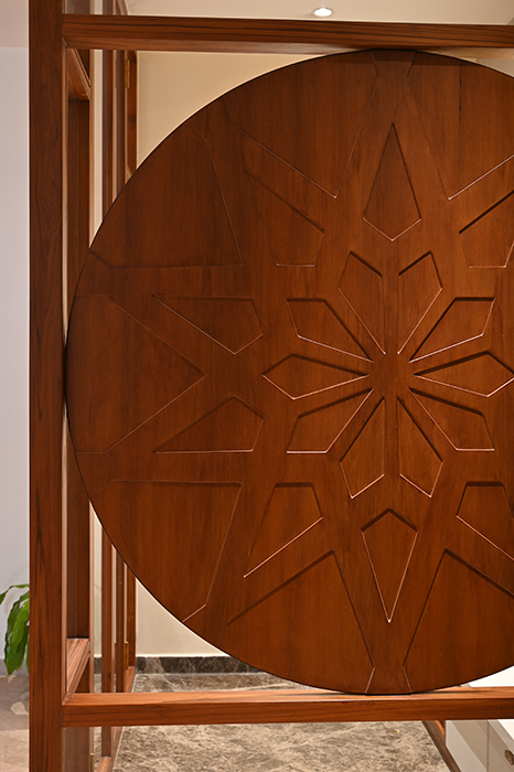 This 5 BHK residence features an intricate partition design in the foyer, leading to a finely crafted marble-clad TV unit. The dining area hosts a matching table with a designer light fixture at its center. A breakfast nook, blending seamlessly with the kitchen's color scheme, adds a touch of elegance. A sleek headboard and seating area accompany a guest wardrobe. A beautifully designed pooja area, enclosed by a glass partition with a designer wood carving, stands opposite a detailed office workstation. The master bedroom is accentuated by vertical lines in a concrete finish, the wardrobe incorporating the scooped-out volumes juxtaposed with solid ones against the wall creates an intriguing design. The other two bedrooms boast simpler backdrops with splashes of color. The guest bedroom on the second floor features a blend of wood and blue decor for the headboard. A cozy conversation area transitions to the open terrace.