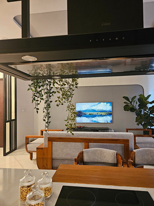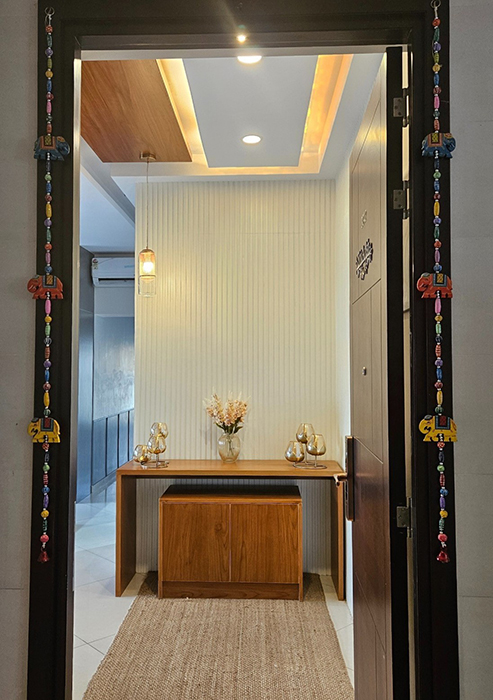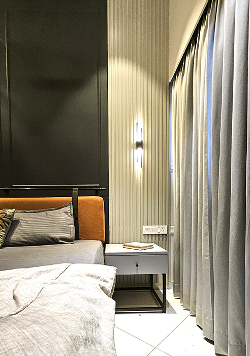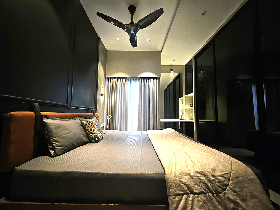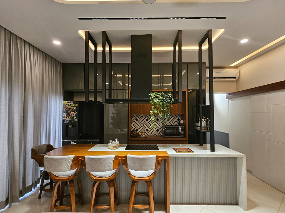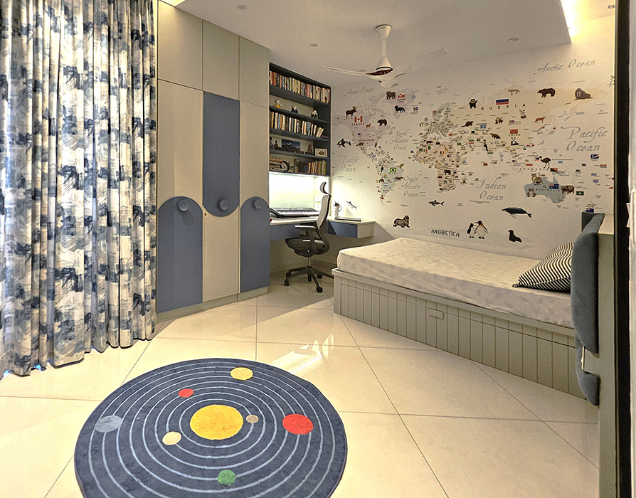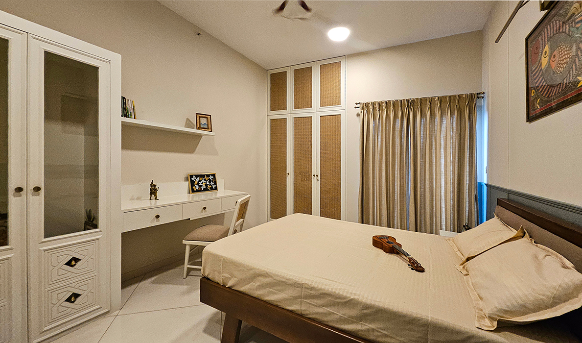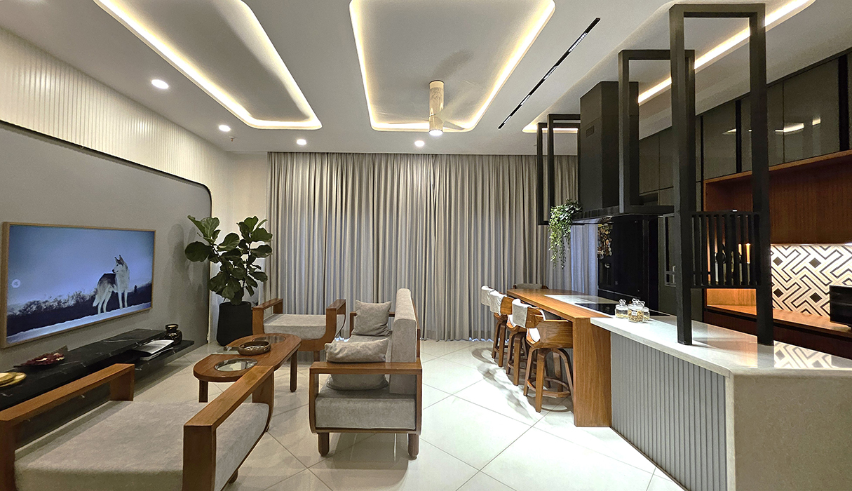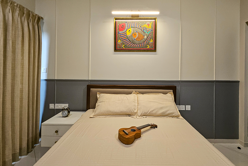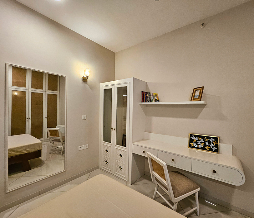 This elegant Neo Classical home combines classical sophistication with contemporary charm, featuring a calming neutral color palette with crisp whites, soft creams, and delicate beiges, subtly accented with soft blues and light mint greens. The design boasts a minimalist approach with simplified forms and clean lines, while eclectic accents incorporating modern or abstract art pieces add a touch of elegance. The spacious interior includes an open-plan living room and kitchen, a serene master bedroom, a cozy kids' bedroom doubling as a workspace, and a stylish guest bedroom, all perfectly balancing opulence and simplicity to create a timeless and sophisticated living space.